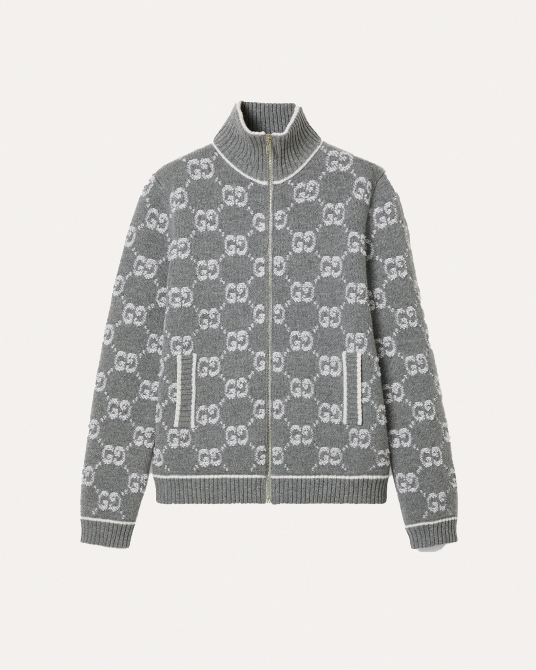 Eleganter Zip-Cardigan aus weichem Wollmix in Grau mit kontrastierendem, weißem GG-Allover-Muster. Gerippter Stehkragen, Bündchen und...