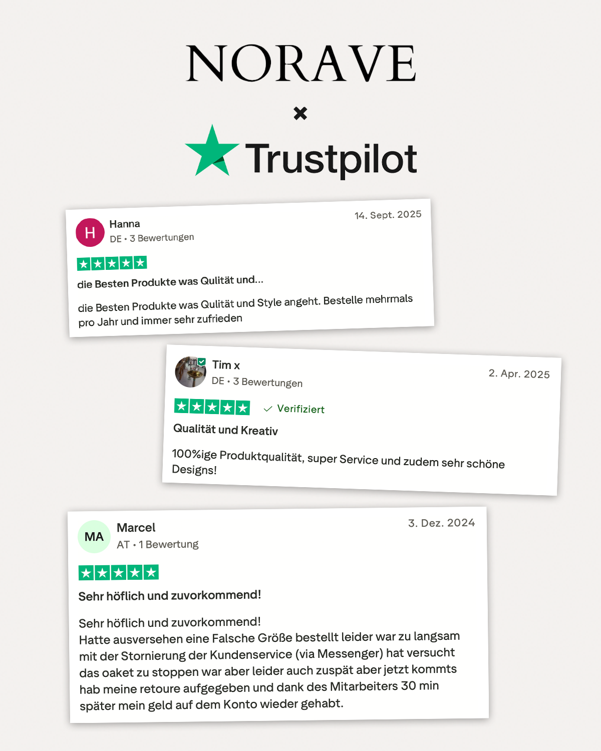 Wir legen Wert auf Qualität bis ins Detail. Deine Bestellung kommt in einer stylischen, nachhaltigen NORAVE-Verpackung – sicher, minimalistisch und ready to unbox.